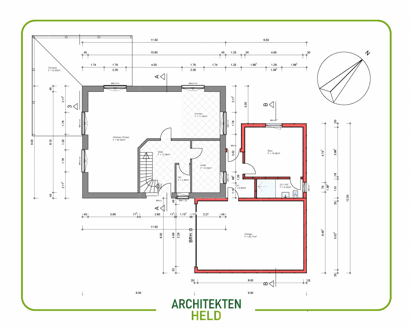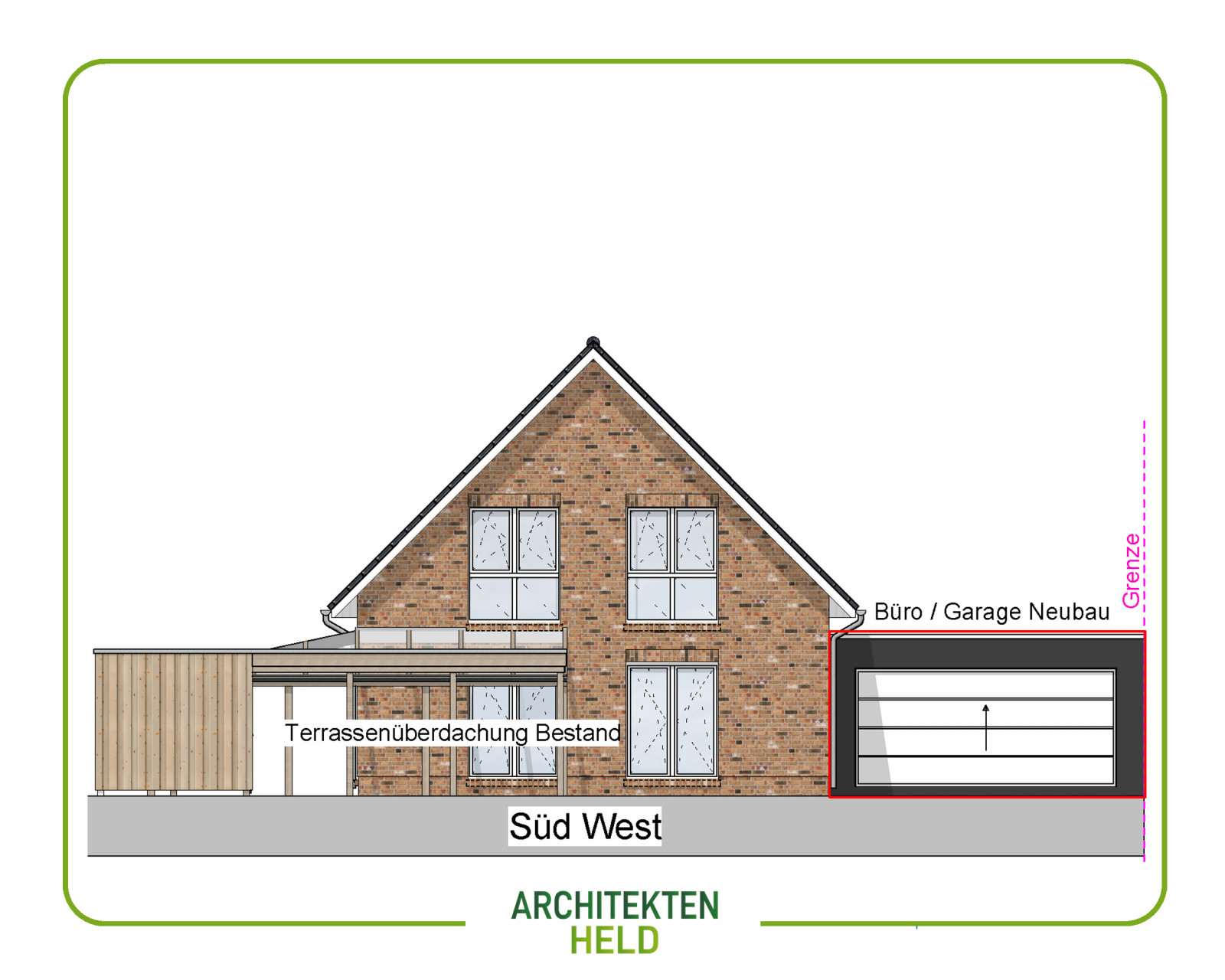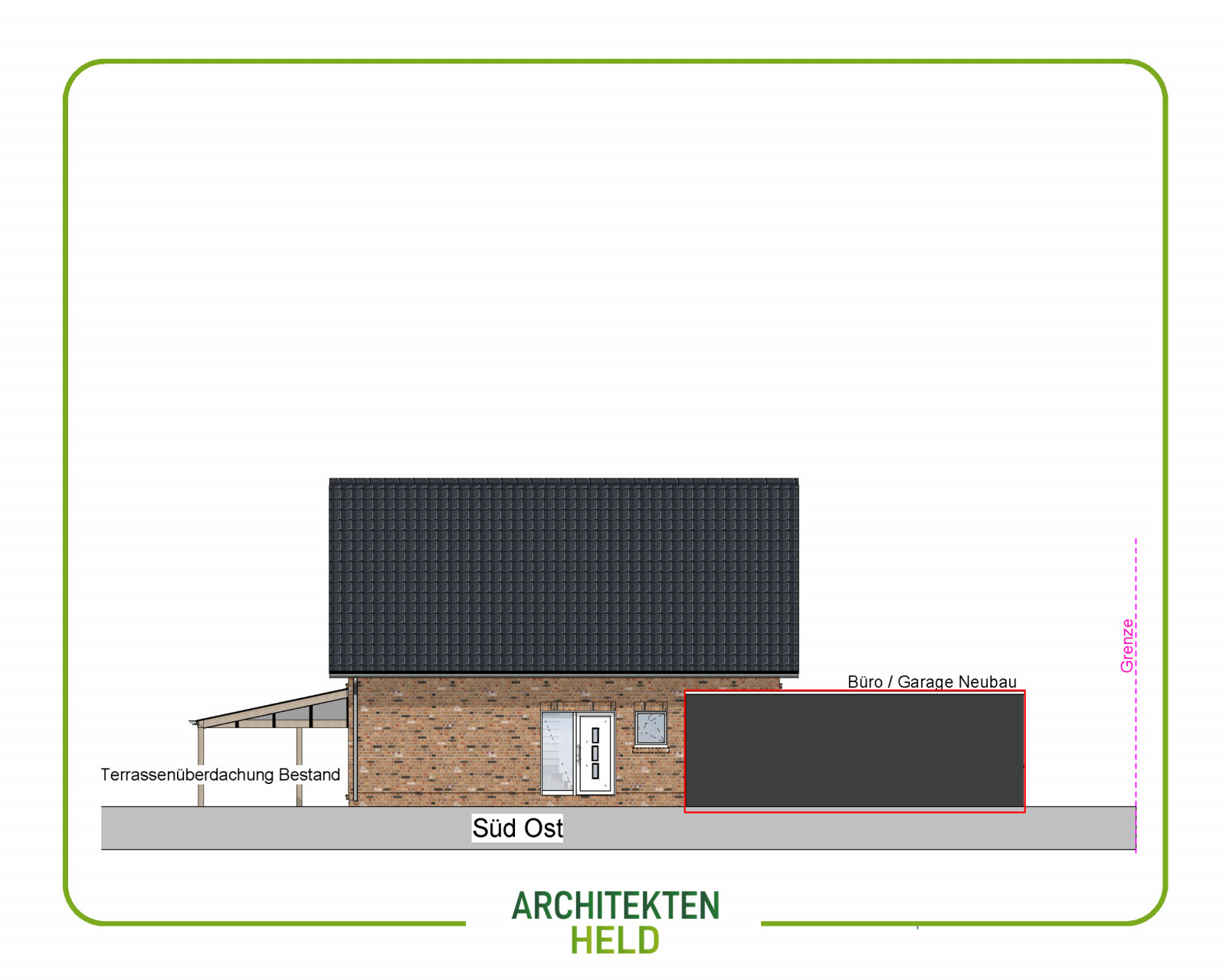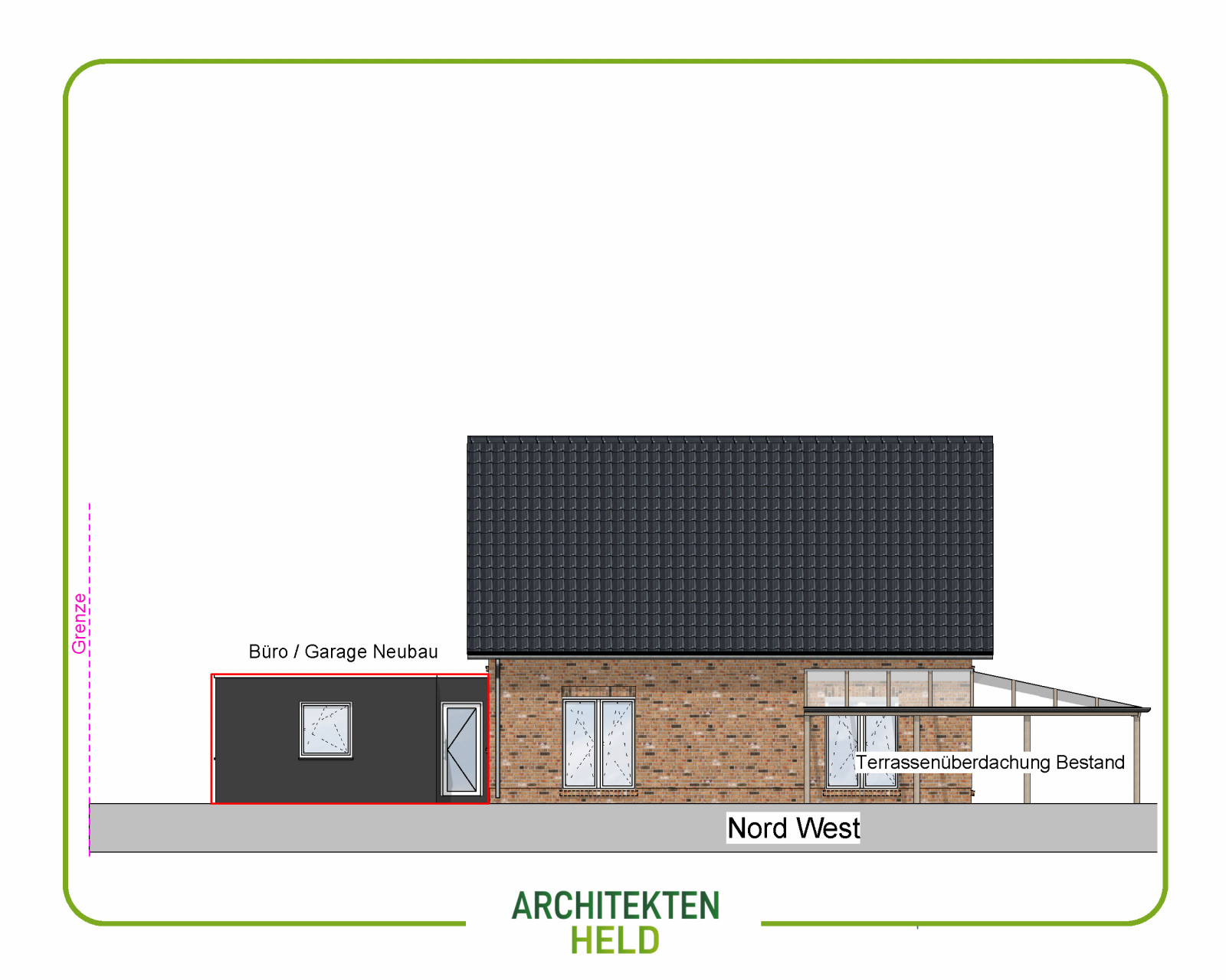 Wir haben auf Kundenwunsch eine Garage und einen Büroraum als Anbau an ein Bestandsgebäude geplant.